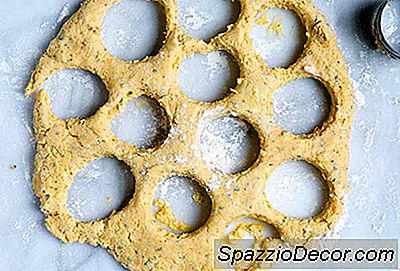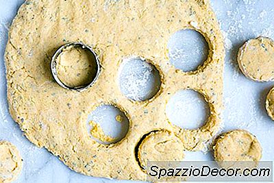 Pasul 4: Așezați aluatul pe o suprafață ușor frezată și presărați mai multă făină peste partea de sus. Aplicați ușor aluatul și formați un cerc. Folosind un tăietor 2-inch pentru biscuiți sau cookie (sau o mărime mai mare, dacă doriți), apăsați în aluat și răsuciți. Aruncați biscuiții pe o foaie de coacere cu pergament.