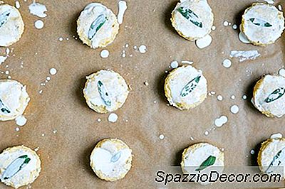 Pasul 6: Așezați biscuiții pe o foaie de copt pergament. Puneți topurile biscuiților cu cremă și apoi puneți o frunză mică de salvie pe fiecare biscuit. Puneți frunza cu puțină cremă suplimentară. Coaceți într-un cuptor preîncălzit timp de aproximativ 12 minute sau până când vârfurile sunt de aur. Lăsați biscuiții să se răcească puțin înainte de servire.